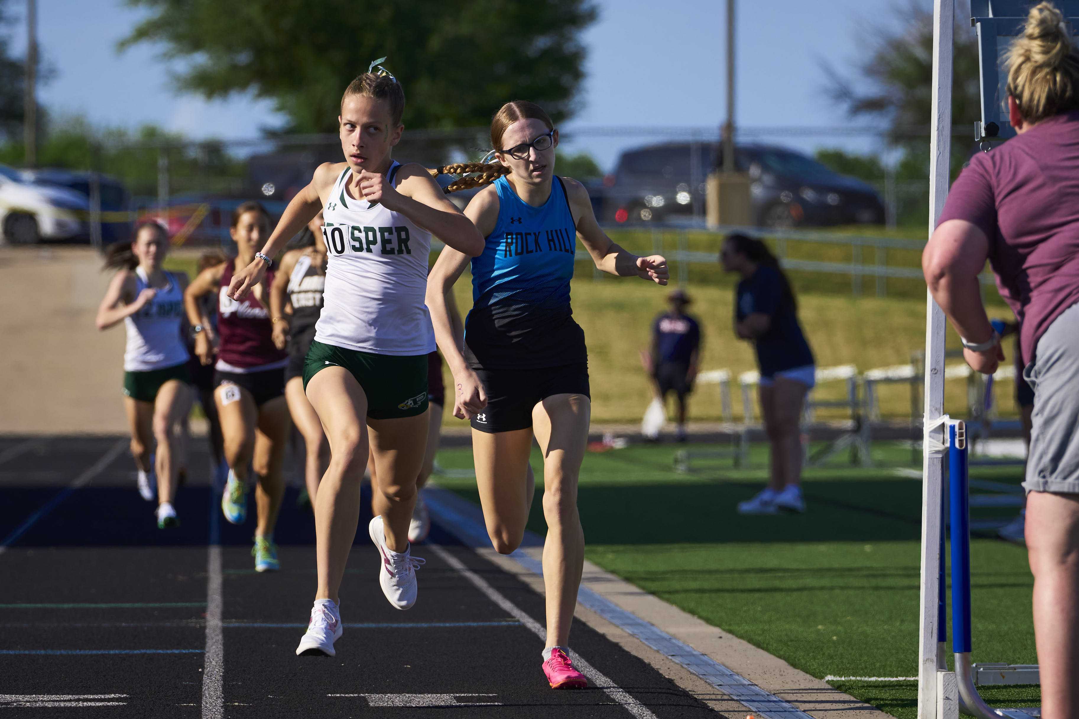 Taylor Peck of Prosper crosses the finish first in the District 6-6A 800m race.